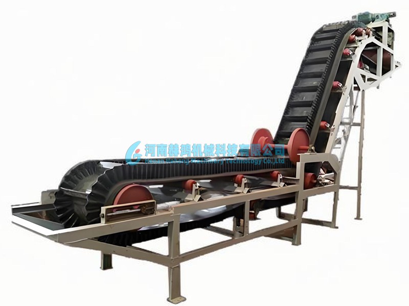 大傾角輸送機是一種專門設(shè)計用于在陡峭坡度上高效、連續(xù)地輸送各種散狀物料的輸送設(shè)備。大傾角輸送機的輸送帶具有波狀擋邊(裙邊)和橫向隔板(橫隔板)。波狀擋邊位于輸送帶兩側(cè),形成類似“堤壩”的結(jié)構(gòu),防止物料從兩側(cè)撒漏。橫向隔板以一定間距固定在基帶和擋邊之間,形成一個個封閉或半封閉的“格倉”(料斗),有效承載物料并阻止其在傾斜段下滑。
